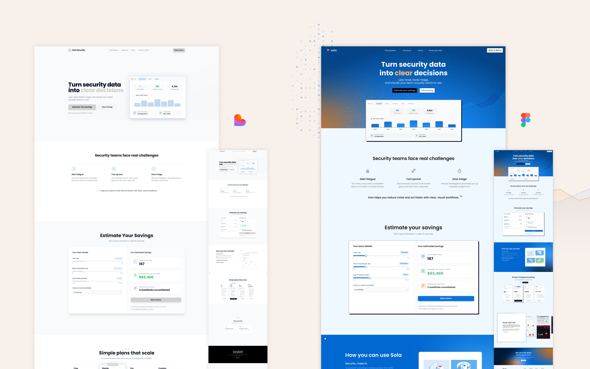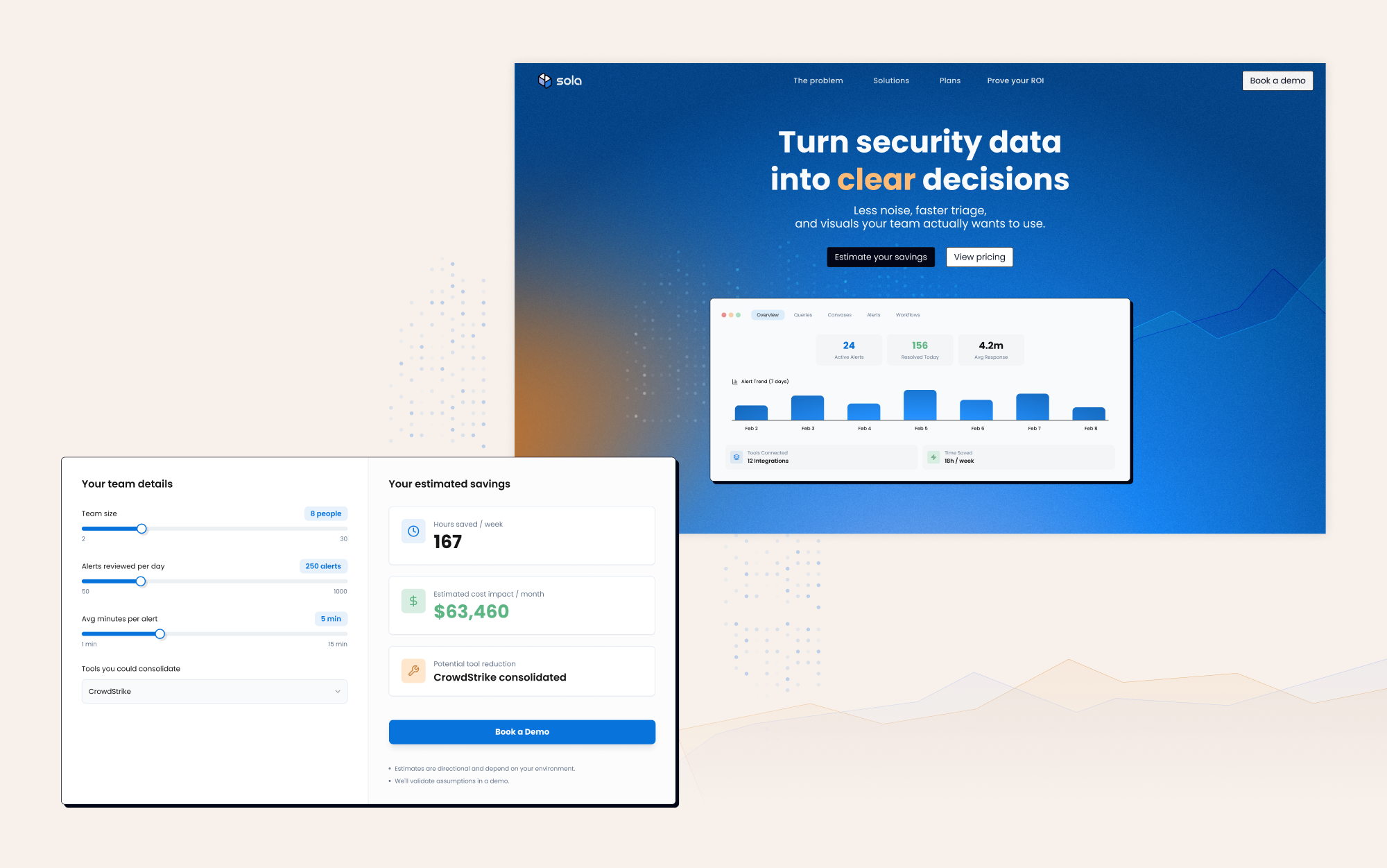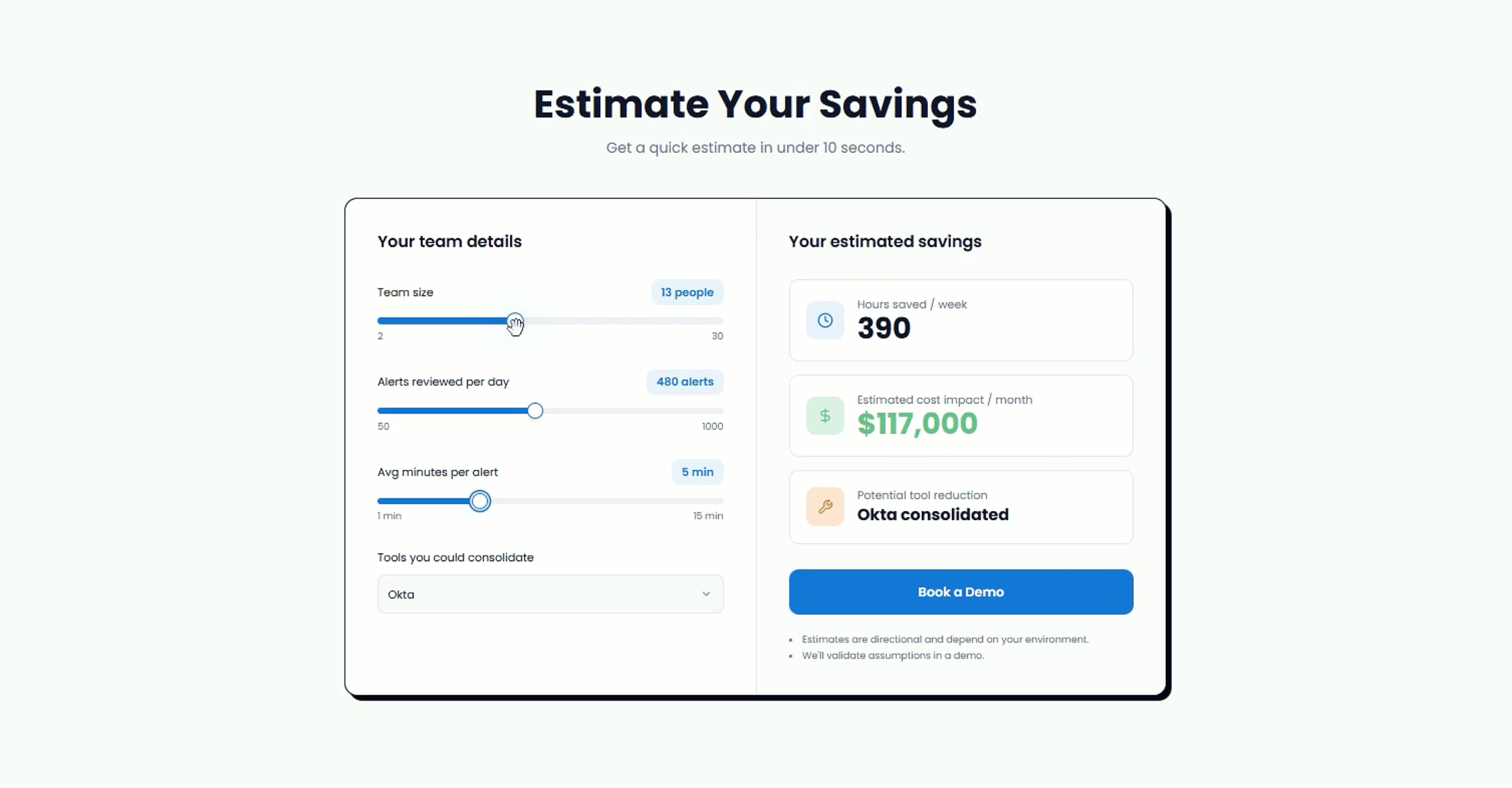 Turned security data into clear storytelling with an interactive savings calculator based on team size, security tools, alert volume, and cost tooling. Started from an AI mockup, then redesigned it to match the brand with a clean, conversion-focused UX.